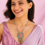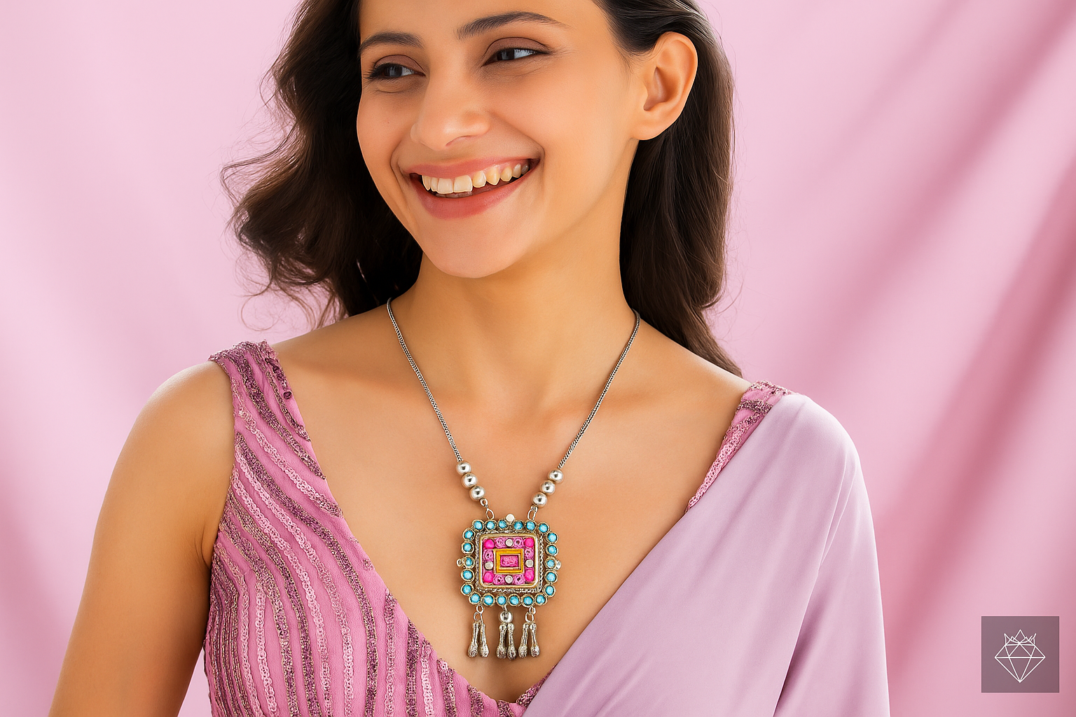 Step into vibrant elegance with the Boho Glam Square Pendant Necklace, a striking accessory that brings together traditional charm and contemporary flair. The eye-catching square pendant is adorned with vivid pink and turquoise accents, framed by silver beads and playful danglers. Suspended on a sleek silver chain with pearl details, this piece adds a joyful, eclectic vibe to both ethnic and modern outfits. Perfect for festive gatherings, cultural events, or when you simply want to stand out with confidence and color.