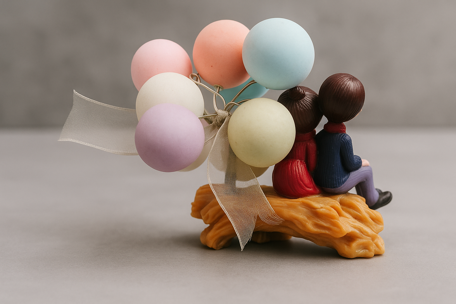Celebrate love and togetherness with this adorable Romantic Couple Showpiece, featuring a smiling couple seated on a wooden-style base, surrounded by colorful balloons and a delicate ribbon bow. The heartwarming design and cheerful expressions make it a perfect symbol of affection and bonding.