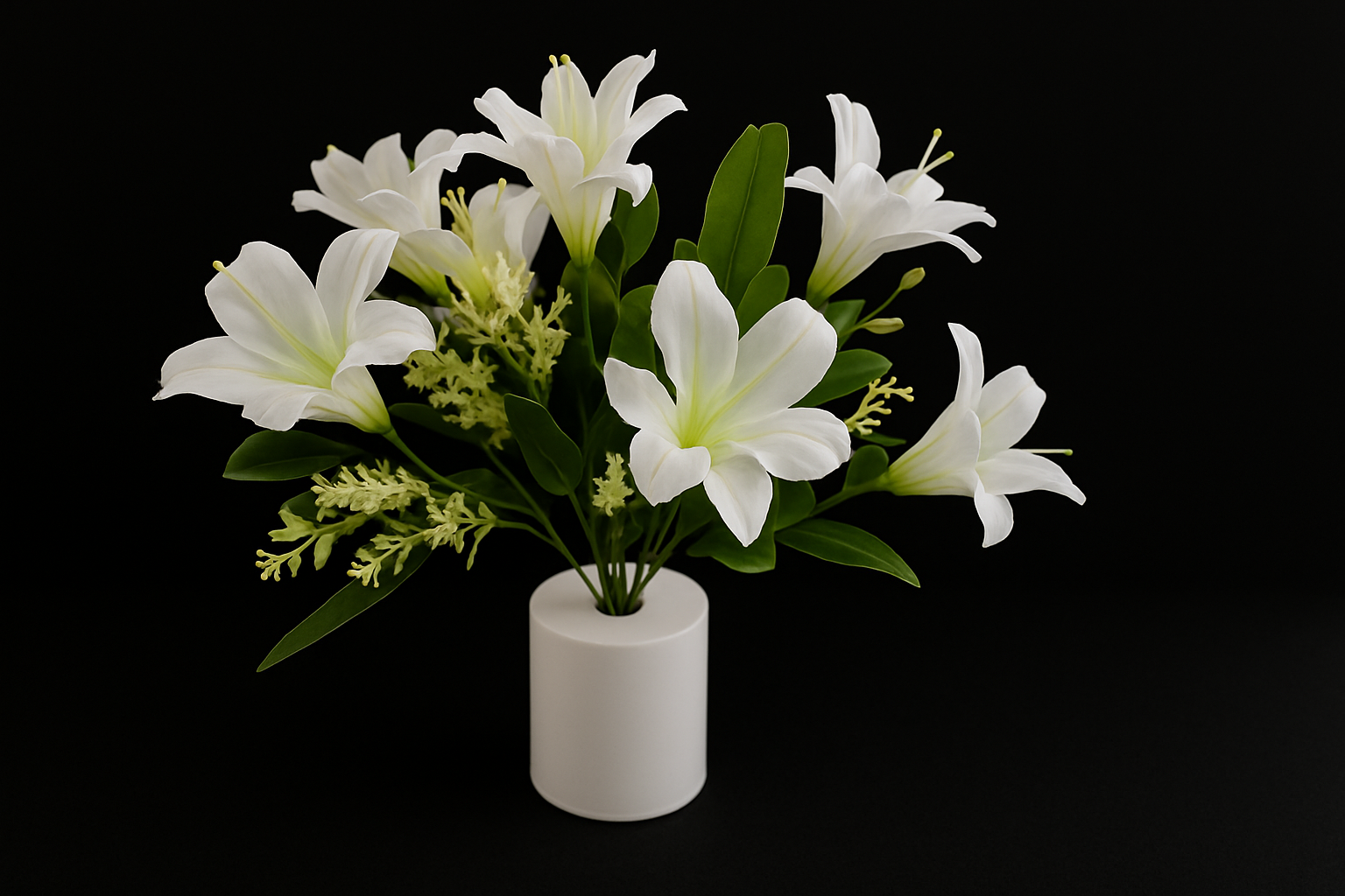 Bring timeless elegance to your space with the Elegant White Lily Artificial Flower Arrangement. Featuring lifelike white lilies accented with green foliage and delicate yellow blossoms, this arrangement is presented in a sleek white cylindrical vase. Perfect for home décor, offices, or gifting, it offers a fresh and sophisticated look without the need for maintenance. Ideal for adding a touch of natural beauty to any setting year-round.