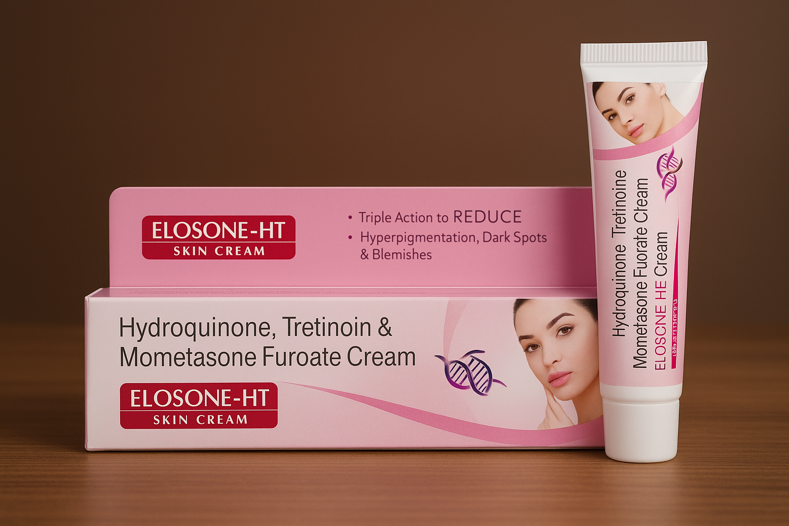 Elosone-HT Skin Cream combines Hydroquinone, Tretinoin, and Mometasone Furoate to deliver a triple-action formula designed to reduce hyperpigmentation, dark spots, and blemishes. This dermatologically active formulation targets uneven skin tone and discoloration, promoting clearer, more radiant skin. Suitable for topical use under medical supervision.