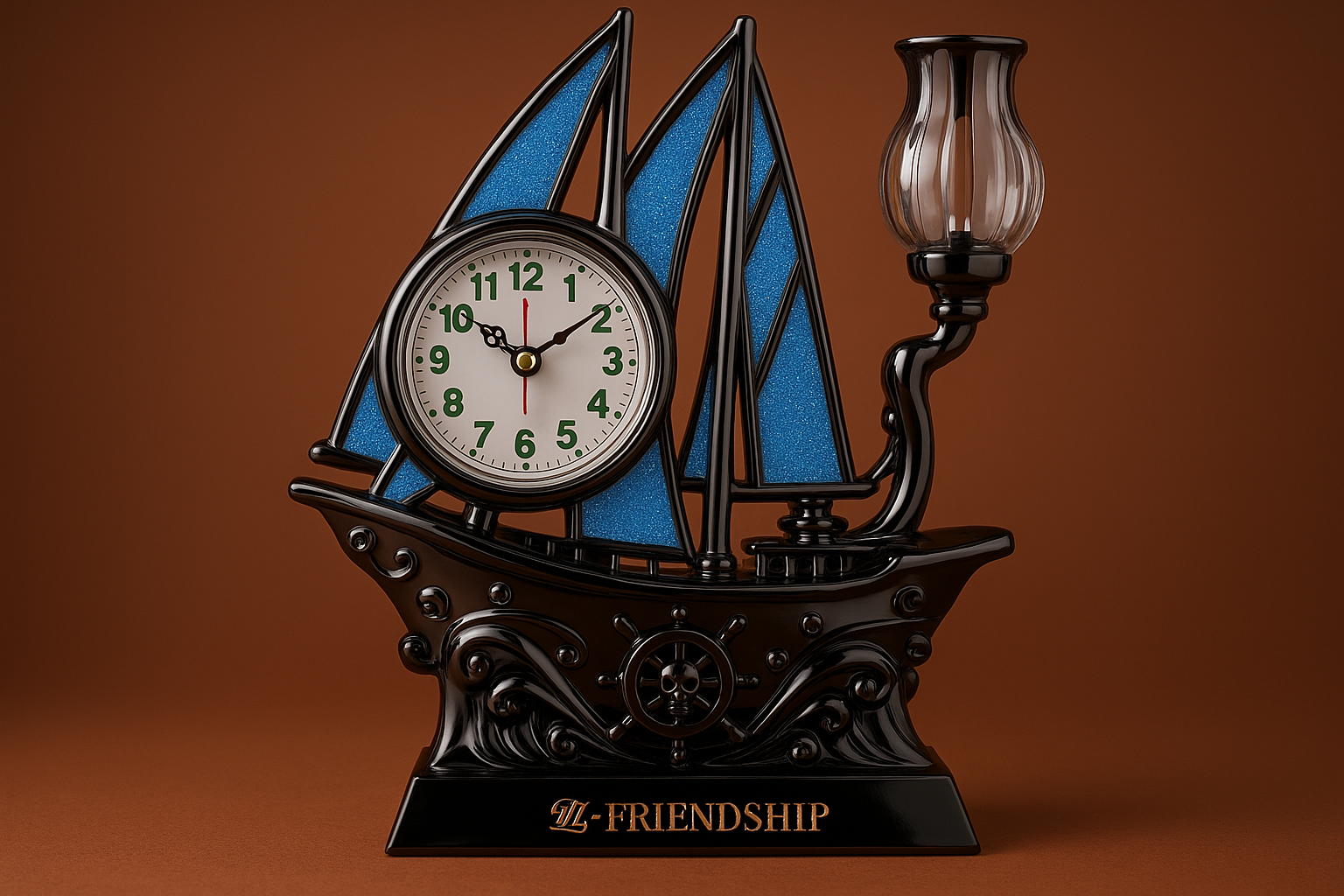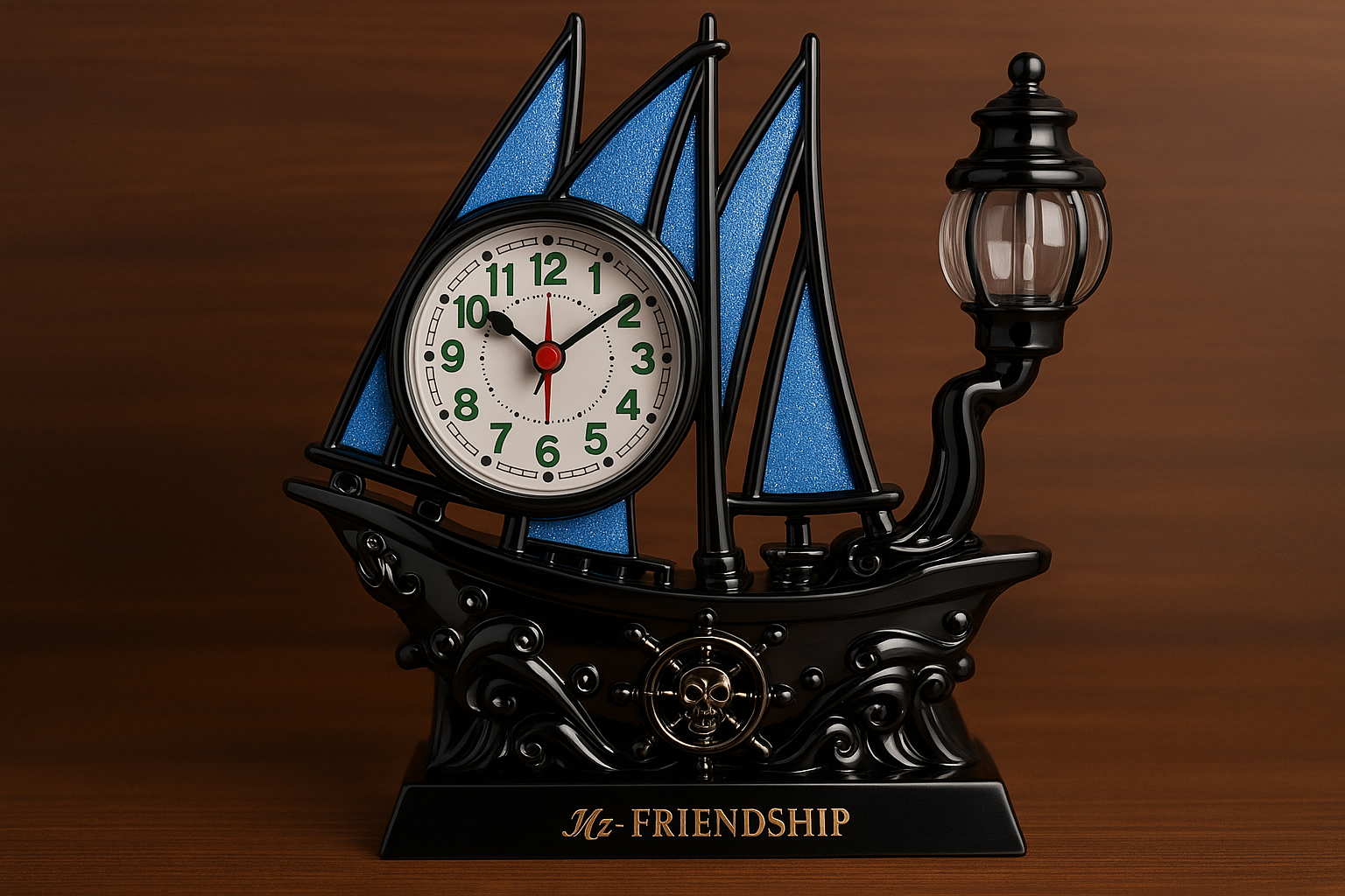 Add a touch of charm and timeless elegance to your space with this Friendship-themed Decorative Table Clock, uniquely crafted in the shape of a sailing ship with blue sails and a vintage-style lantern. Featuring a bold analog dial with green numerals, this showpiece is perfect for both timekeeping and home décor.