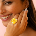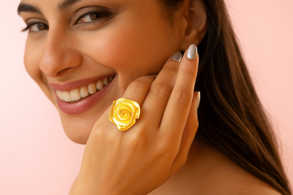 Radiate elegance with the Golden Rose Statement Ring, a bold and beautiful accessory that captures the delicate charm of a blooming rose. Crafted in a striking golden hue, this ring is designed to turn heads and elevate your style. The sculpted petals swirl gracefully to form a floral centerpiece, making it perfect for both festive occasions and chic everyday looks. Comfortable to wear and visually captivating, this ring is the ideal blend of femininity and sophistication.