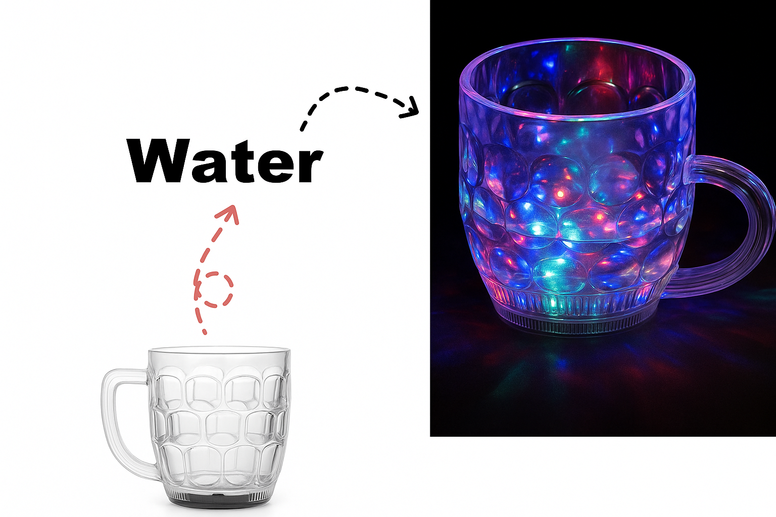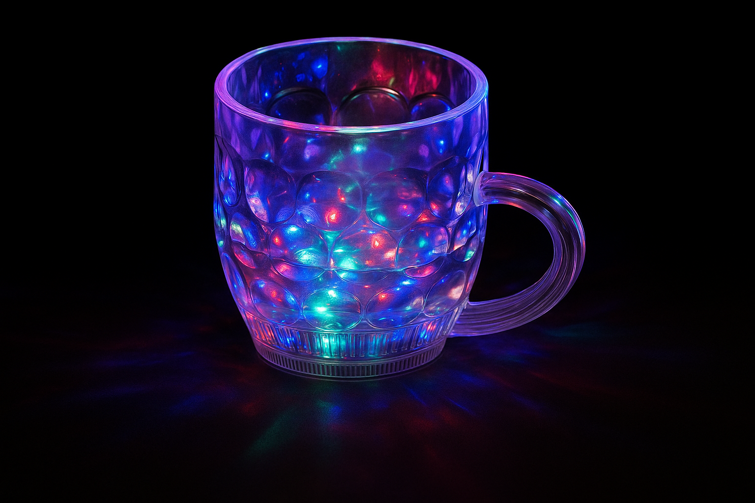 Turn every sip into a celebration with the LED Light-Up Party Mug. This transparent mug features a bubble-textured design and is equipped with multi-colored LED lights that illuminate the entire cup in vibrant hues of blue, red, green, and purple. Ideal for parties, night events, or festive occasions, the mug creates a fun, glowing effect that enhances your drinking experience. Perfect for both kids and adults, this mug is a must-have for anyone who loves adding a touch of sparkle to their beverages.