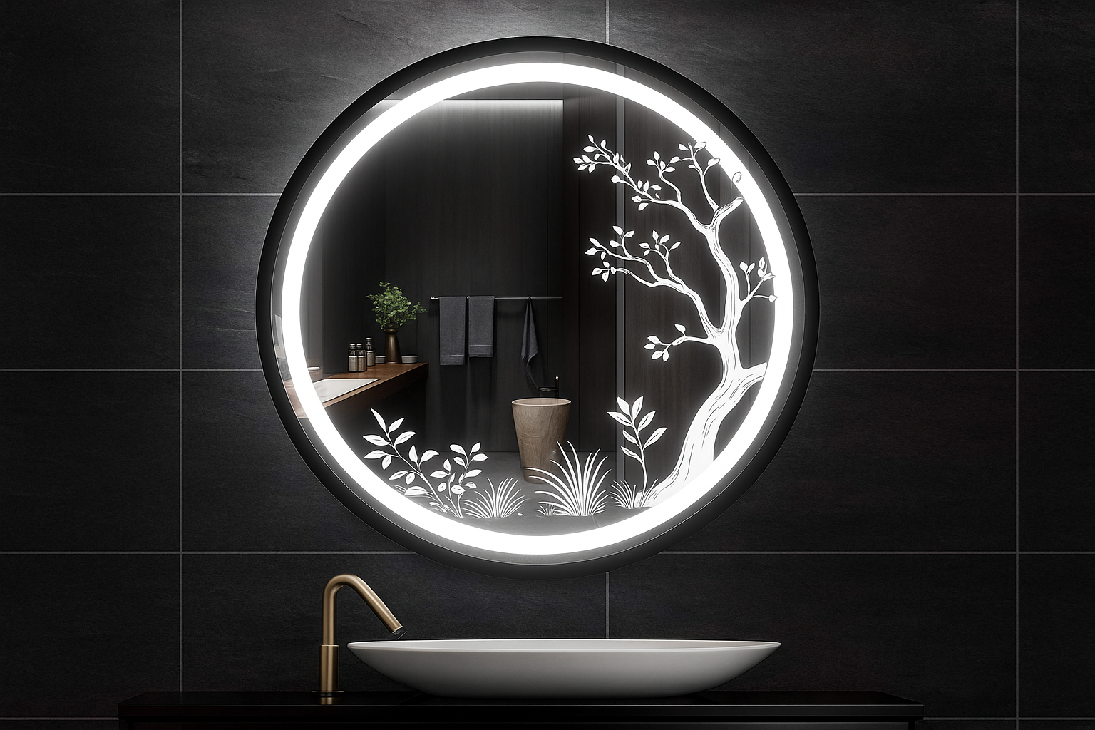 Elevate your bathroom experience with the LumaGlow NatureTouch LED Mirror — a stunning blend of modern design and natural elegance. This round, wall-mounted mirror features a soft backlit LED ring for perfect illumination and a unique etched tree-and-leaf design that adds a serene, spa-like feel to any space. Ideal for luxury bathrooms, the high-definition mirror provides crystal-clear reflection, while the touch-sensitive controls allow for easy light adjustment. A perfect fusion of functionality and style, this mirror transforms everyday routines into moments of tranquility.