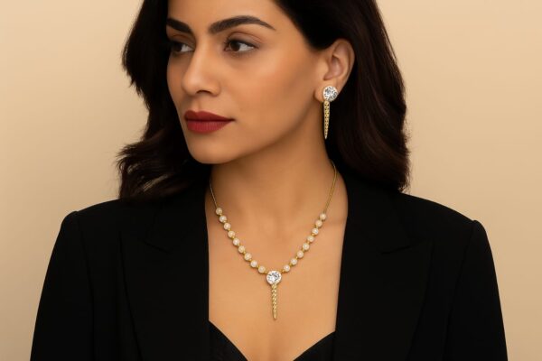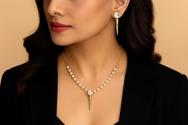 Step into sophistication with this exquisite Pearl Dagger Elegance Set, featuring a graceful pearl beaded necklace adorned with a dazzling central crystal and a sleek gold-toned spike pendant. Paired perfectly with matching drop earrings showcasing the same brilliant crystal and spike motif, this set exudes modern luxury and elegance. Ideal for formal occasions, evening events, or elevating your everyday look, this jewelry set blends classic pearls with bold contemporary flair.