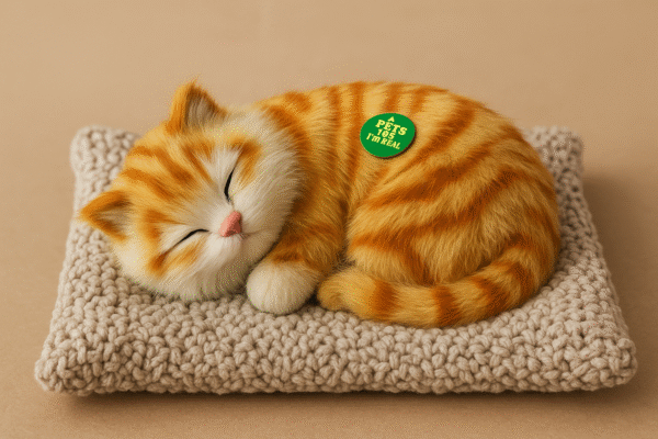 Bring home the charm of a real feline without the fuss with the PetsYos Realistic Sleeping Cat Toy. Designed to look and feel just like a real kitten, this lifelike orange tabby features soft fur, a peaceful sleeping pose, and comes resting on a cozy, hand-knitted cushion. With intricate details and a lifelike breathing motion, it’s perfect for pet lovers, elderly companions, or as a comforting home décor piece. Whether used as a stress-reliever or a cuddly faux pet, it’s a heartwarming addition to any space. A sticker proudly states: “I’m REAL” — but no feeding required!