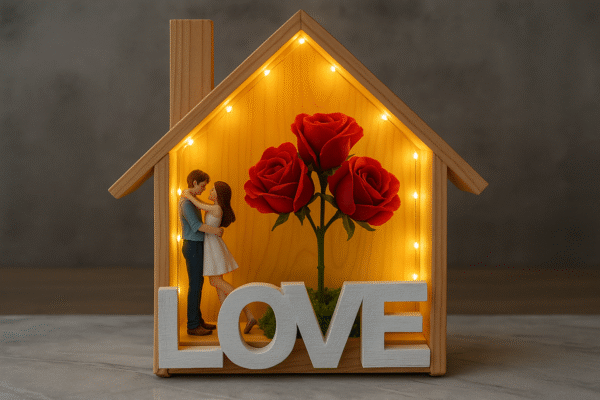 Celebrate love with this beautifully crafted Romantic LED Love House Decor. Featuring a cozy wooden house frame, it showcases an intimate couple figurine, three vibrant red roses, and soft glowing LED lights. The large white “LOVE” lettering adds a heartfelt touch, making it the perfect gift for anniversaries, Valentine’s Day, or home décor. Its warm ambiance and elegant design create a lovely atmosphere in any space. Ideal for bedrooms, living rooms, or as a centerpiece for romantic occasions.