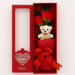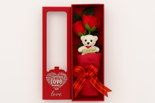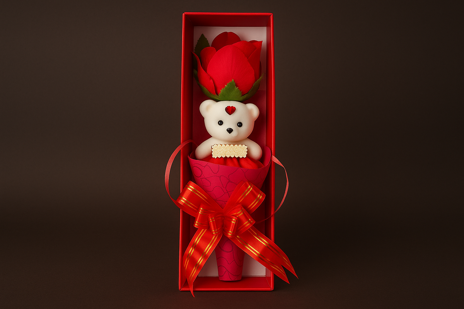 Surprise your loved one with this adorable Romantic Rose Teddy Gift Box, a perfect blend of charm and elegance. This beautifully packaged gift features a cute white teddy bear adorned with a red heart and holding a mini floral accent, nestled inside a vibrant red cone that blooms with an artificial red rose. The ensemble is enhanced by a luxurious red and gold satin ribbon, all encased in a sleek red presentation box. Ideal for Valentine’s Day, anniversaries, birthdays, or any special occasion to express love and affection. A gift that speaks from the heart!