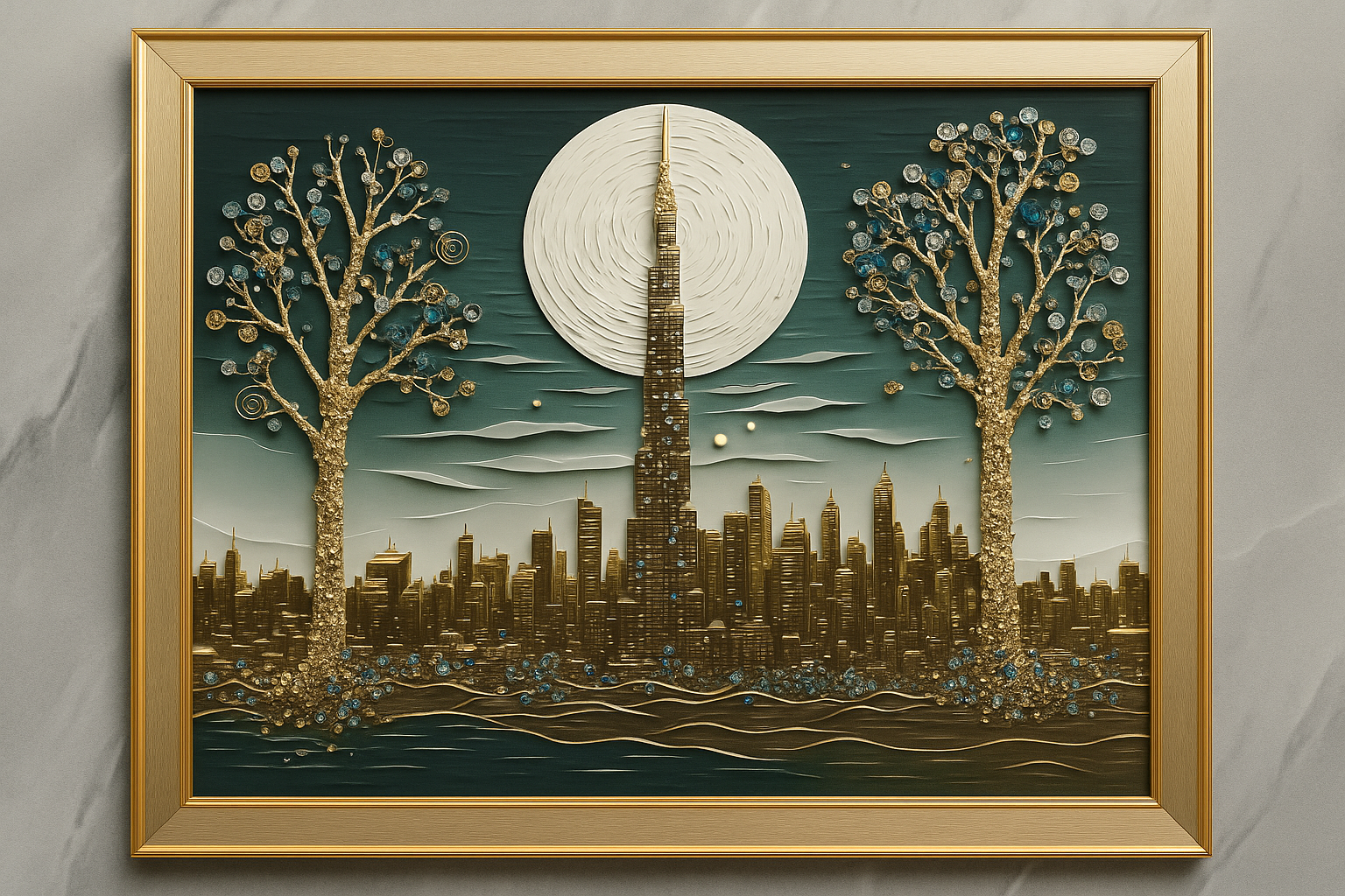 Illuminate your space with the radiant charm of the Moonlit Skyline Luxury 3D Wall Art, a masterpiece blending modern architecture with nature’s elegance. Centered by a towering skyscraper reaching into a luminous full moon, this artwork is flanked by glittering golden trees embedded with blue and crystal-like embellishments. The backdrop features a glistening cityscape that captures both ambition and serenity.