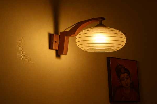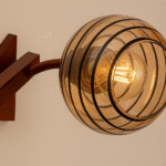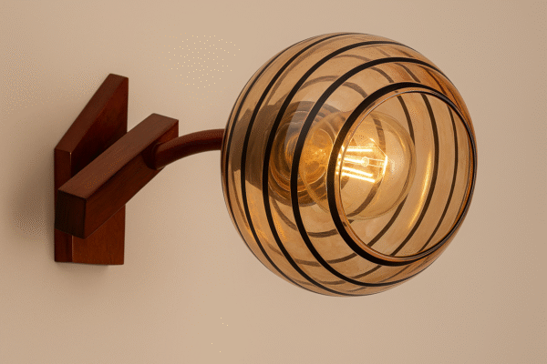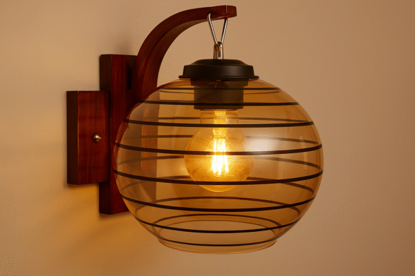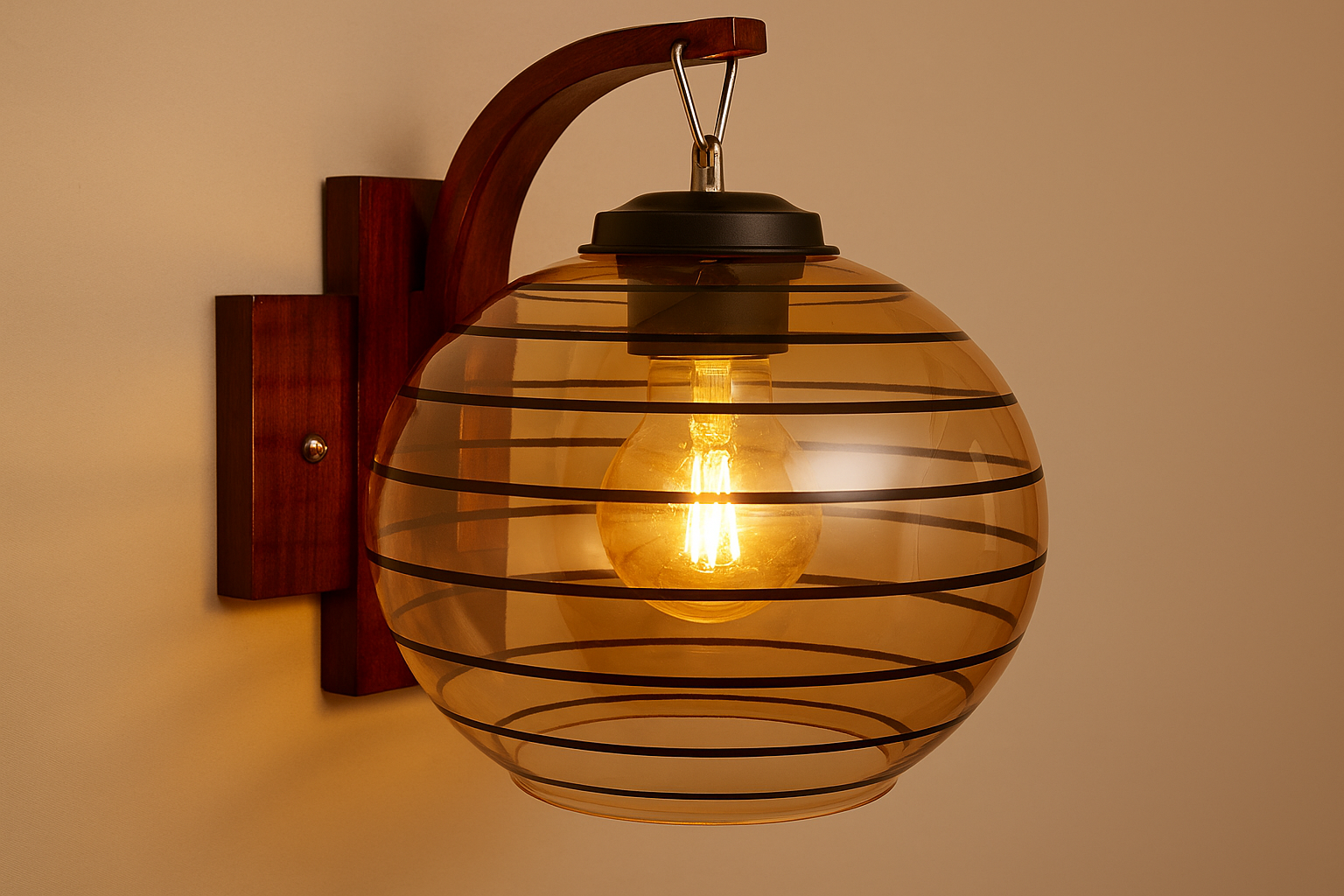 Bring timeless elegance to your home with the Vintage Glow Wooden Wall Lamp. Featuring a gracefully curved wooden arm and a beautifully crafted amber glass globe with black swirl accents, this wall-mounted lamp offers a perfect blend of rustic charm and modern design. The warm, ambient glow from the exposed filament bulb creates a cozy atmosphere, ideal for living rooms, bedrooms, or hallway decor. Crafted for durability and aesthetic appeal, this lamp is a striking statement piece that enhances both traditional and contemporary interiors.